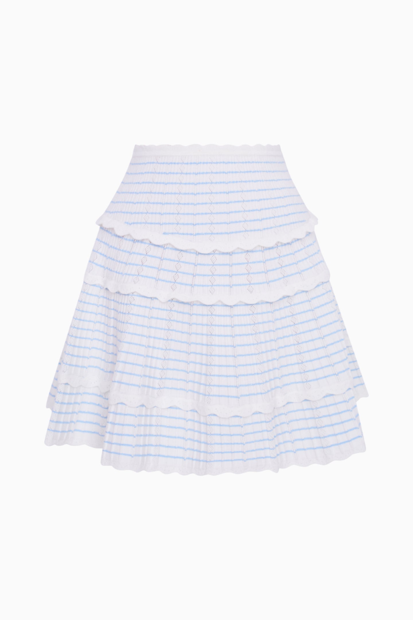 Easy breezy in the Colella Skirt. This pretty mini returns with our best-selling ribbed pointelle yarn featuring a nice stretch and ultra-soft feel. Stripes are knitted throughout with added lurex to give this piece our signature shimmer. Thoughtfully placed scallops break up the A-line silhouette giving it a charming look.