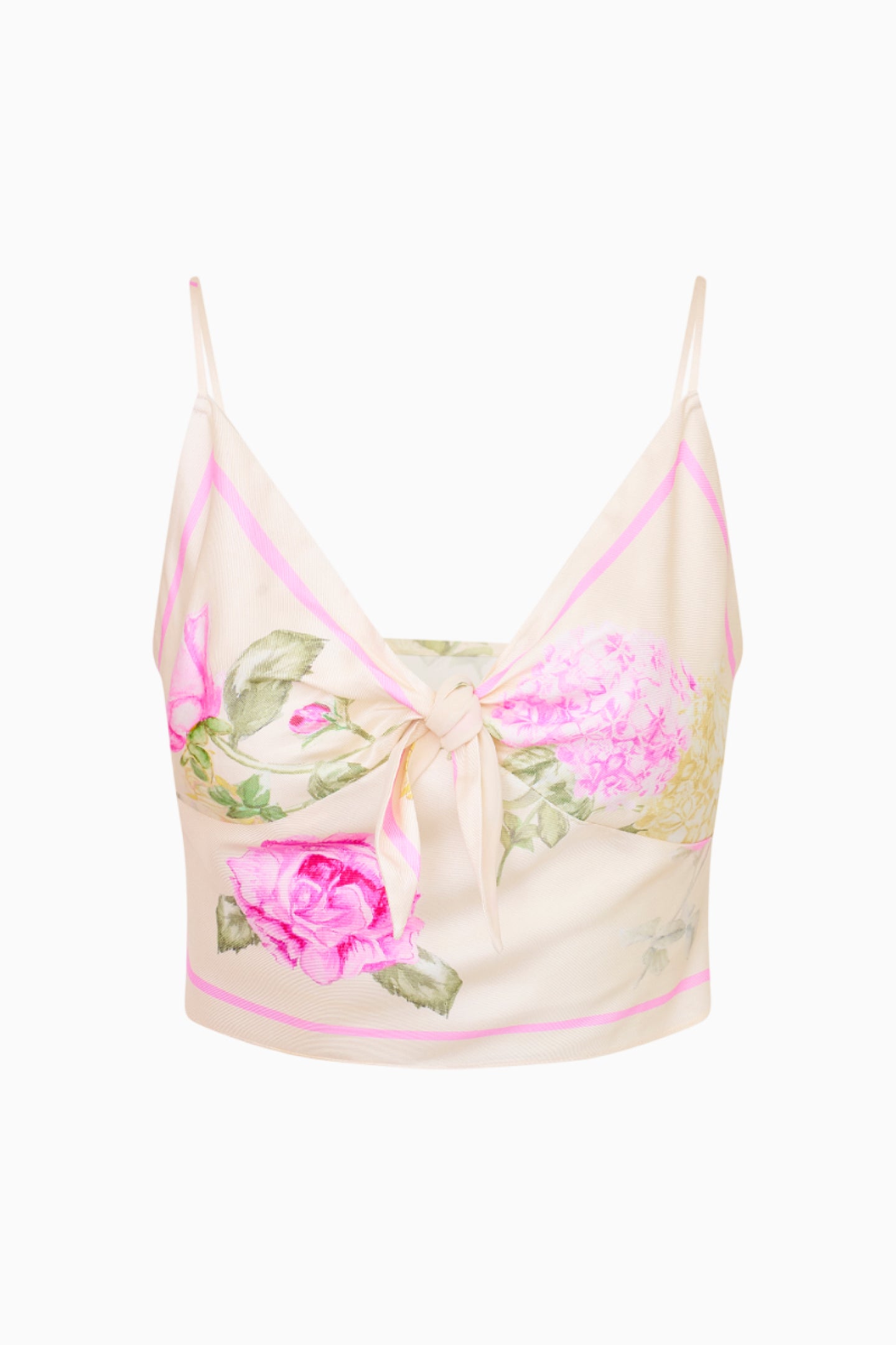 Living in the Emeraine Top. This charming top features an Italian-inspired print with hand-painted flowers in a romantic arrangement. With a scarf-inspired silhouette, the cami ties at the center front, has thin spaghetti straps and hits at the natural waist.