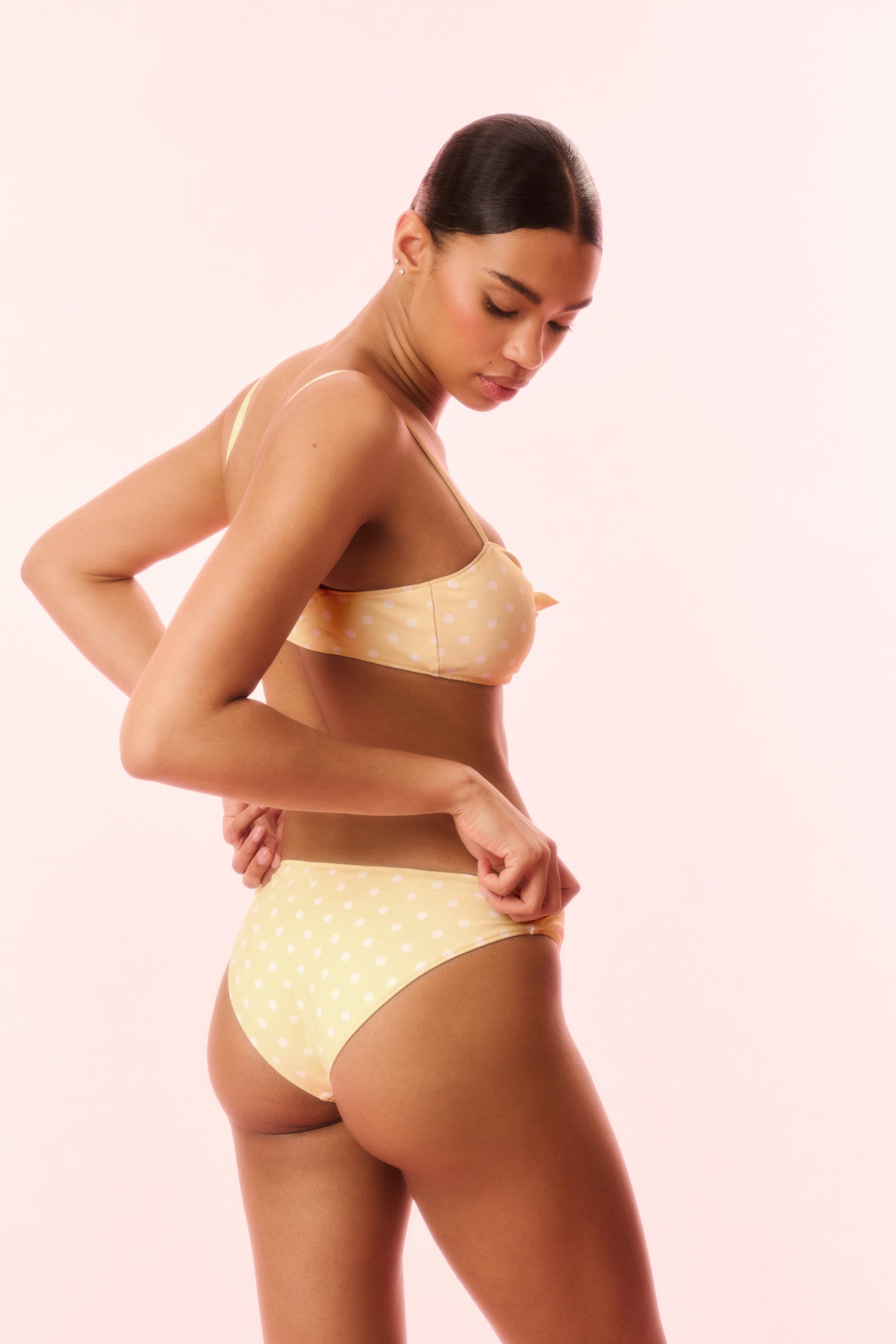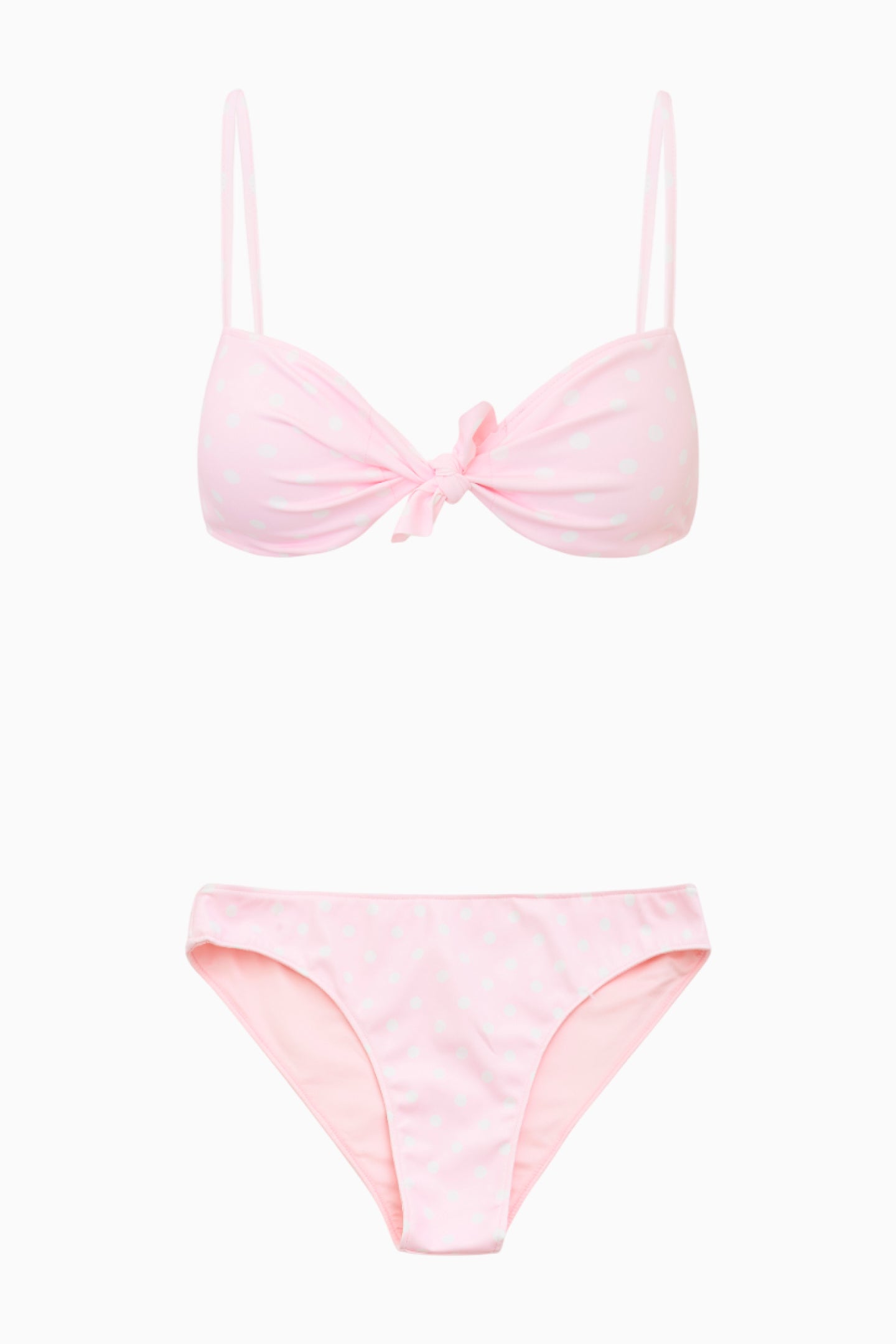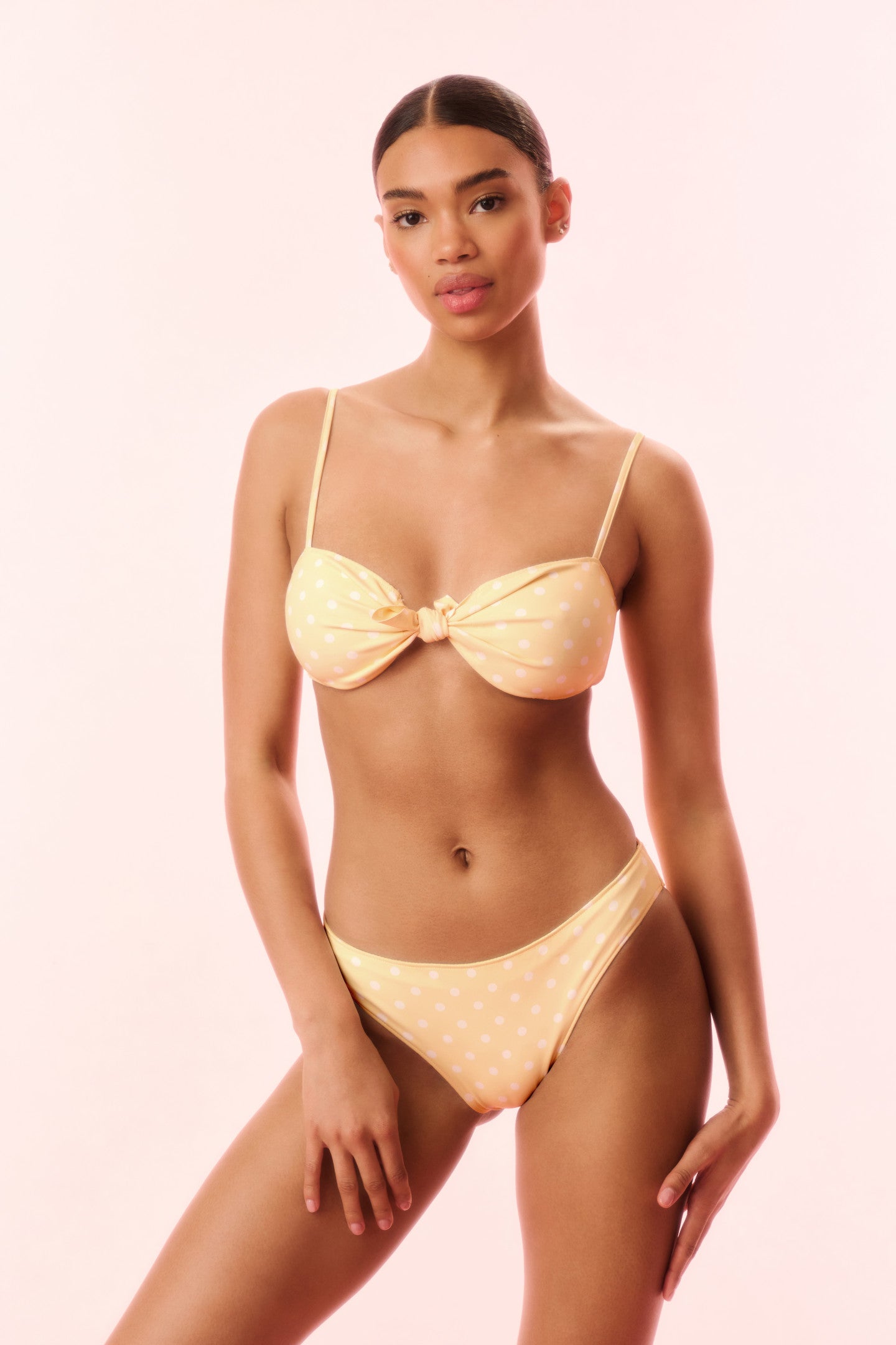 Introducing the Klaudyna Bikini. This sweet swimwear has a tied front for a feminine and flirty look, adjustable spaghetti straps on the top, and low rise bottoms with a little bit of coverage in the back.