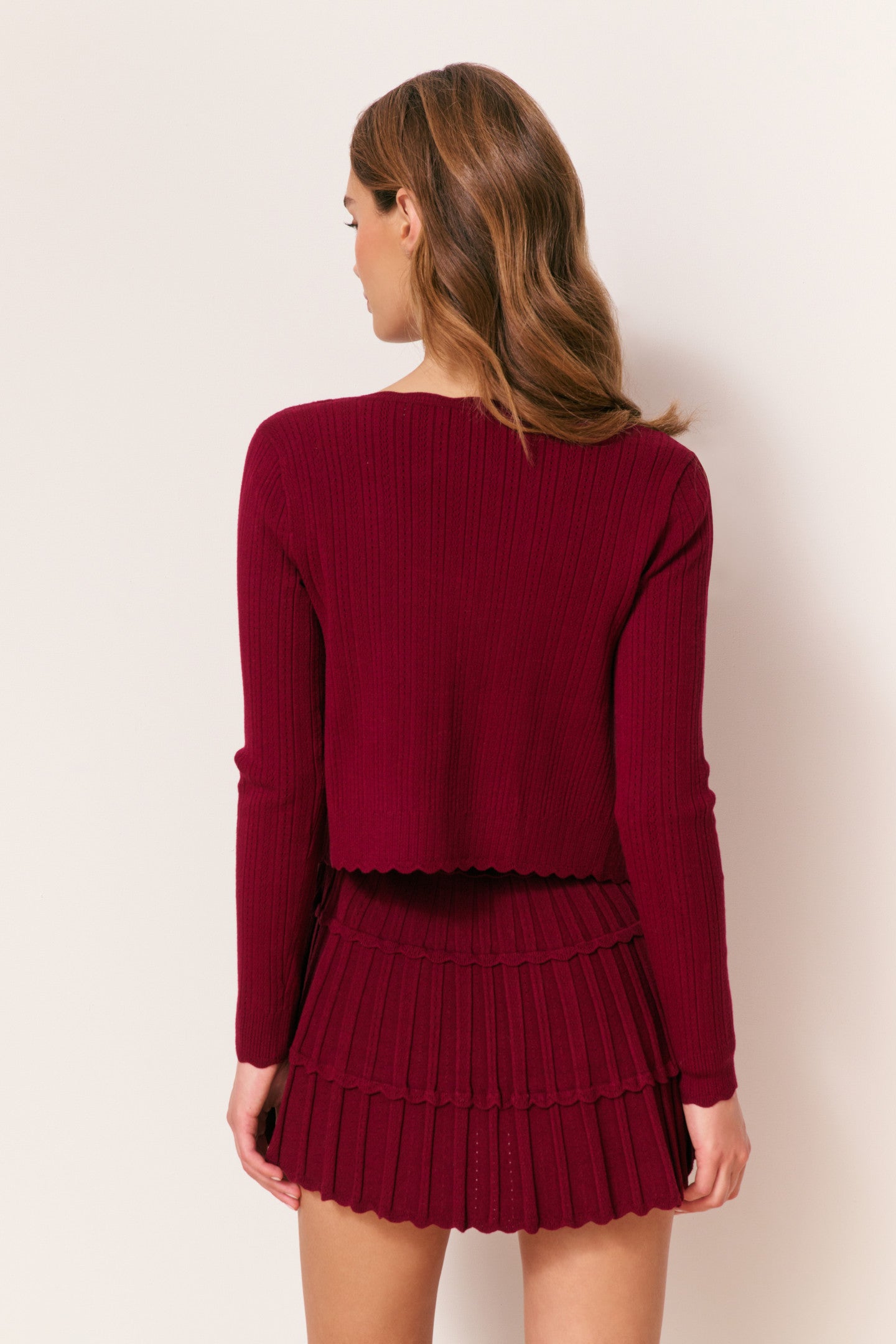 Introducing the Martti Cardigan. This elevated knit arrives in our best-selling extra soft yarn with a comfortable stretch fit and rib pointelle stitch all over. The cardigan begins with a scoop neckline, slim fit sleeves, a placket at the neckline and at the edges, and is finished with our custom LoveShackFancy shell buttons down center front.