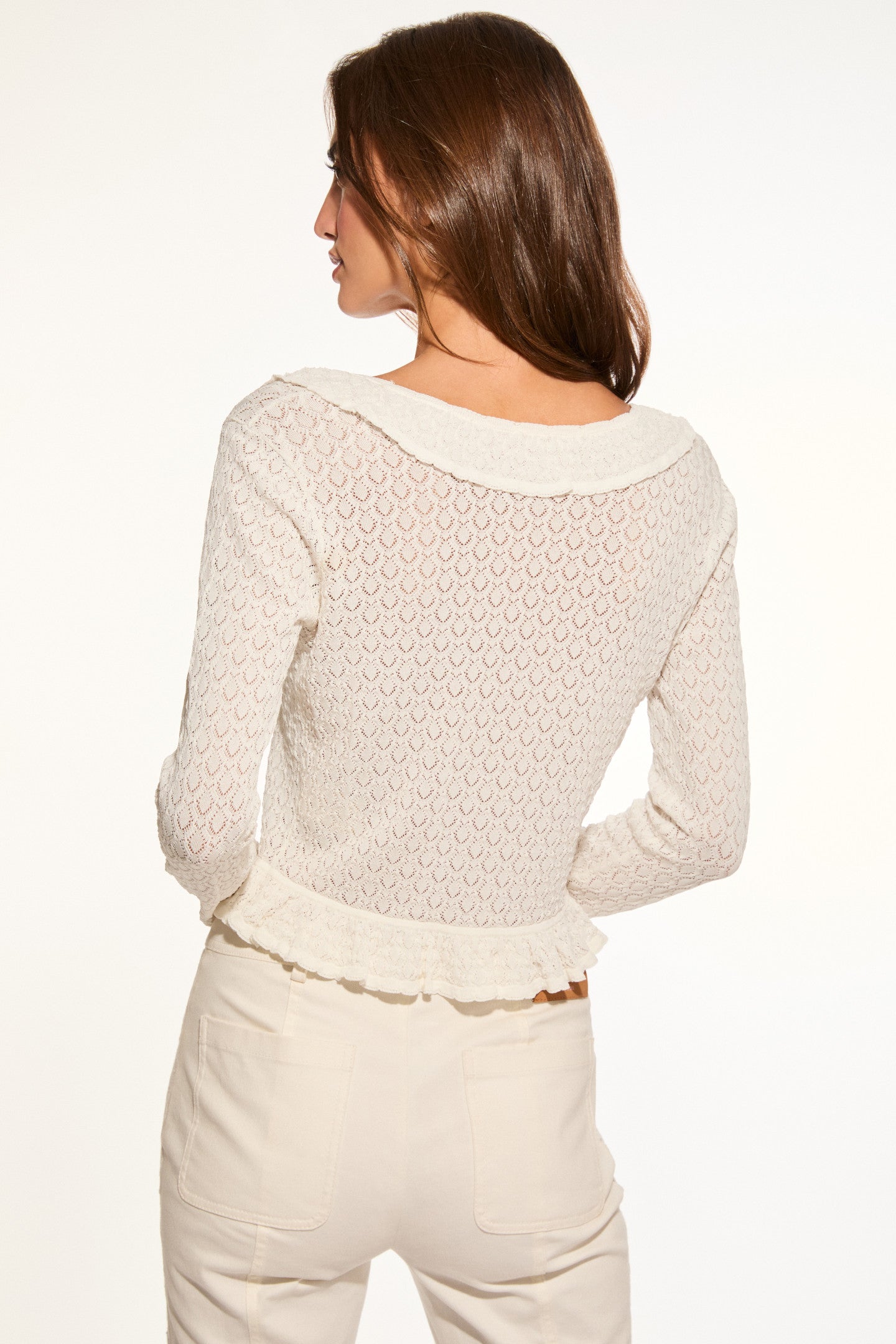Pretty in pink in the Nilah Cardigan. This pretty knit is designed with a lightweight stretch yarn with a delicate pointelle stitch all over. The sweater has a slim-fitting silhouette that’s slightly cropped. A ruffle flounce adorns the neckline while a scallop pointelle trim cascades down the center front placket and hem. Elastic loops feature our custom faux shell buttons down the front. The piece is finished with a peplum hem.