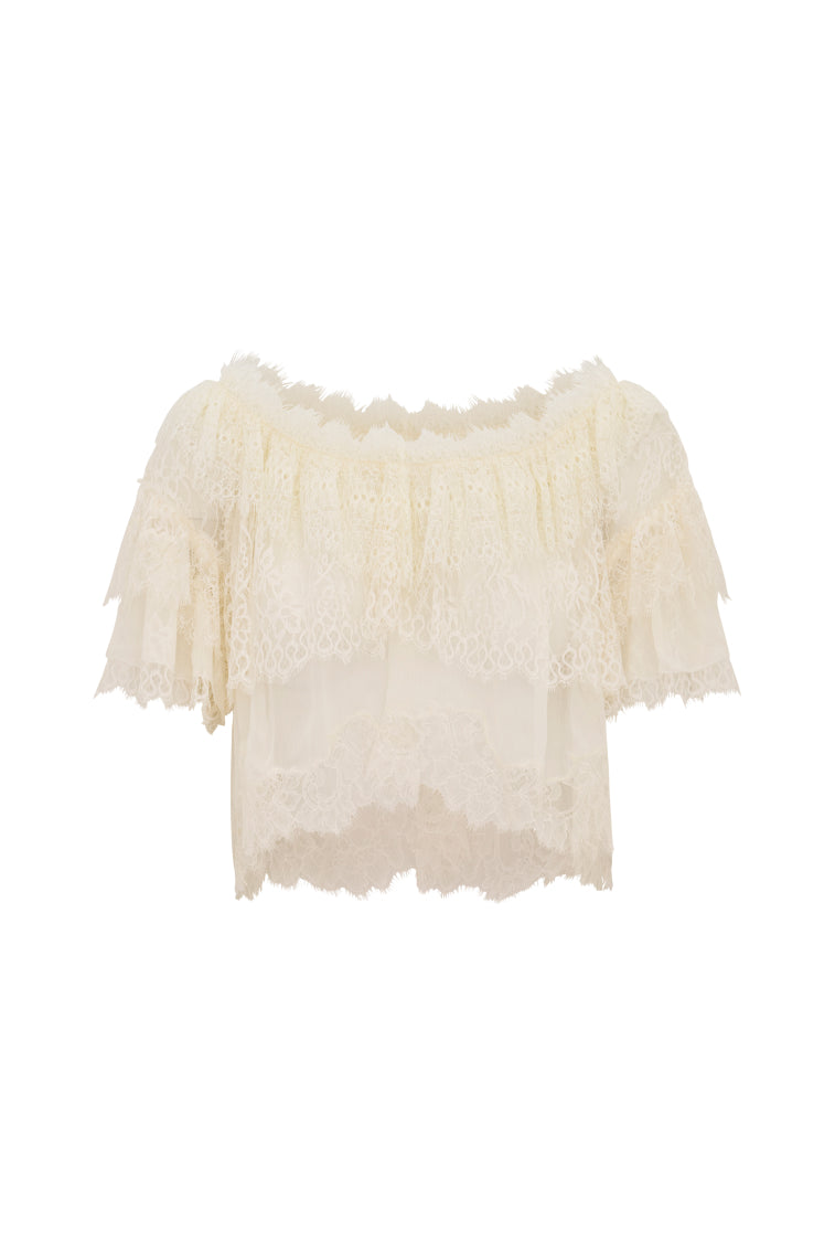 Introducing the Vienne Top. This stunning piece features sheer, lace chiffon all over giving this top a Bohemian-inspired look. With ruffles and layers abound, the top has short sleeves, an open scoop neck, and hits just below the natural waist.